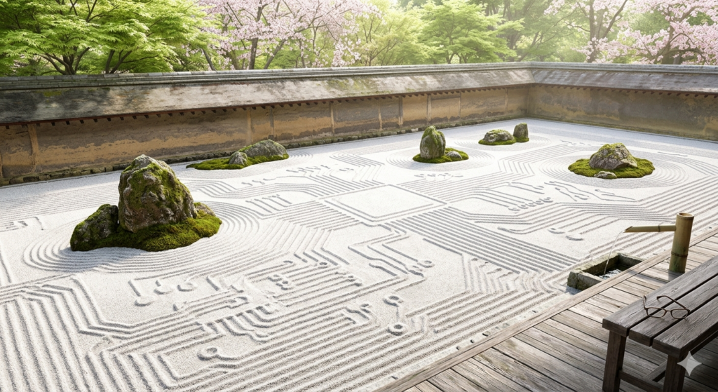 京都の龍安寺に代表される枯山水(かれさんすい)。水を使わず、白砂と石だけで広大な宇宙を表現するその様式は、極限まで無駄を削ぎ落とした「引き算の美」である。私は、日本の半導体製造装置メーカーが誇る技術力の核心に、この枯山水と同じ精神を感じずにはいられない。